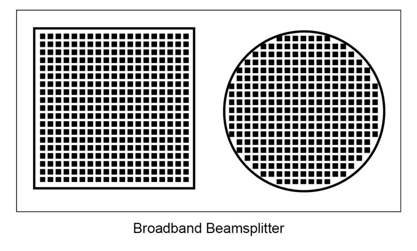 一定間隔・一定量のアルミニウム膜が水玉模様(Polka-Dotとは水玉模様の意)のようにコーティングされていて、その膜厚差に違いを持たせることで光量分割比が決定されるというユニークなビームスプリッターです。波長範囲は250 nm~2000 nm仕様と400 nm~2000 nm仕様の2種類をご用意。光量分割比は8種類をご用意しております。