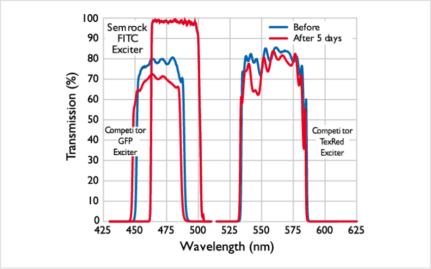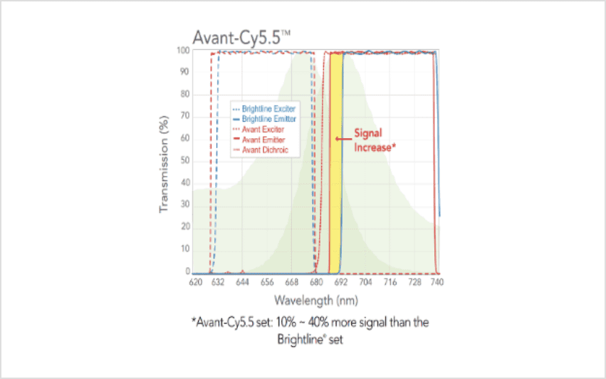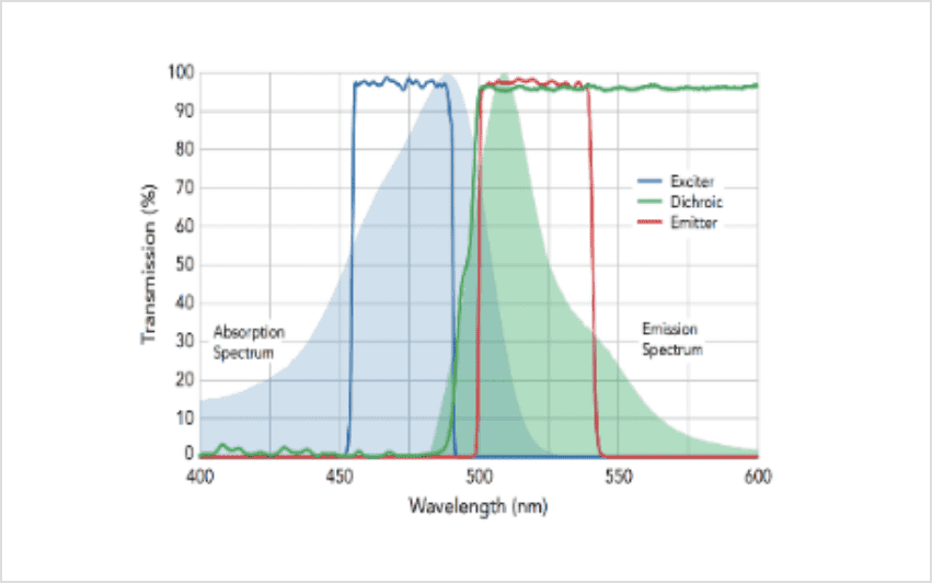 蛍光プローブの吸収波長、蛍光波長スペクトルを確認しながら、目的に応じたフィルターを選定することも可能です。またフィルターをチルトさせて使用する場合、偏光ごとの光学特性を確認することも可能です。