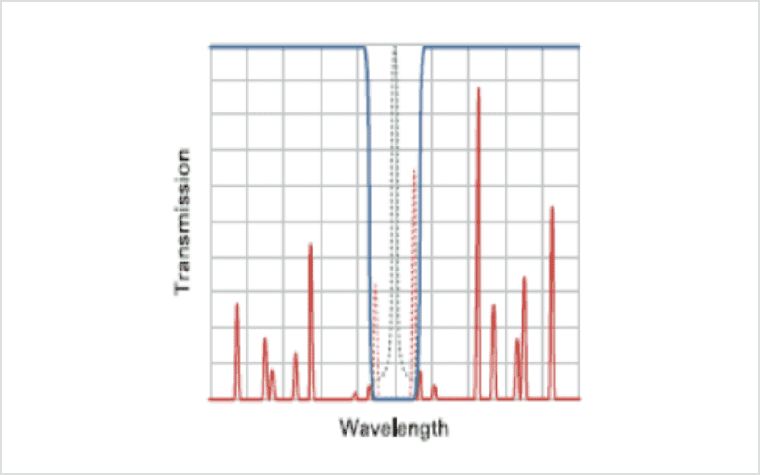 半導体レーザー(Laser Diode)専用のノイズ除去のためのバンドパスフィルターです。代表的な半導体レーザーの発振波長に最適化するよう設計されており、半導体レーザーの個体差や温度特性を考慮して、透過帯幅は6 nm ~10 nmとなっています。