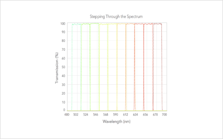中心波長330 nm ~ 740 nmは半値全幅20 nmで、中心波長765 nm ~ 885 nmは半値全幅30 nmで、切れ目なく連続して分光できるよう設計された一連のバンドパスフィルター群です。外径寸法がΦ12.5 mmで、蛍光シグナル検出用途に設計開発されています。