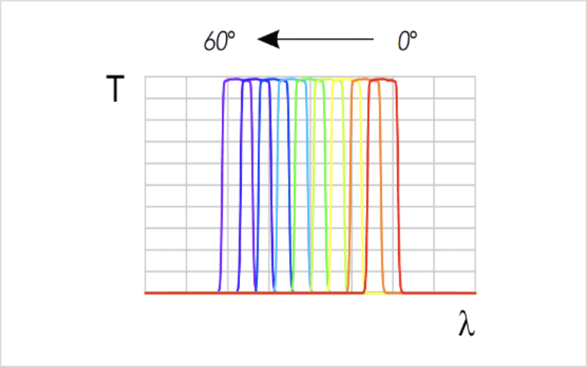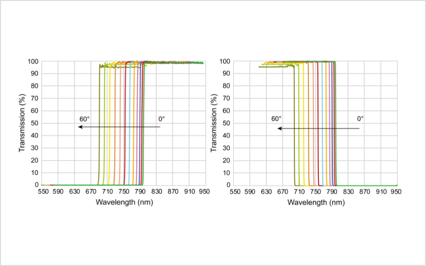 0°~60°まで入射角度を調整することで、一定の波長域において立ち上がり、立ち下がりエッジ波長をチューニングできるエッジフィルターです。
