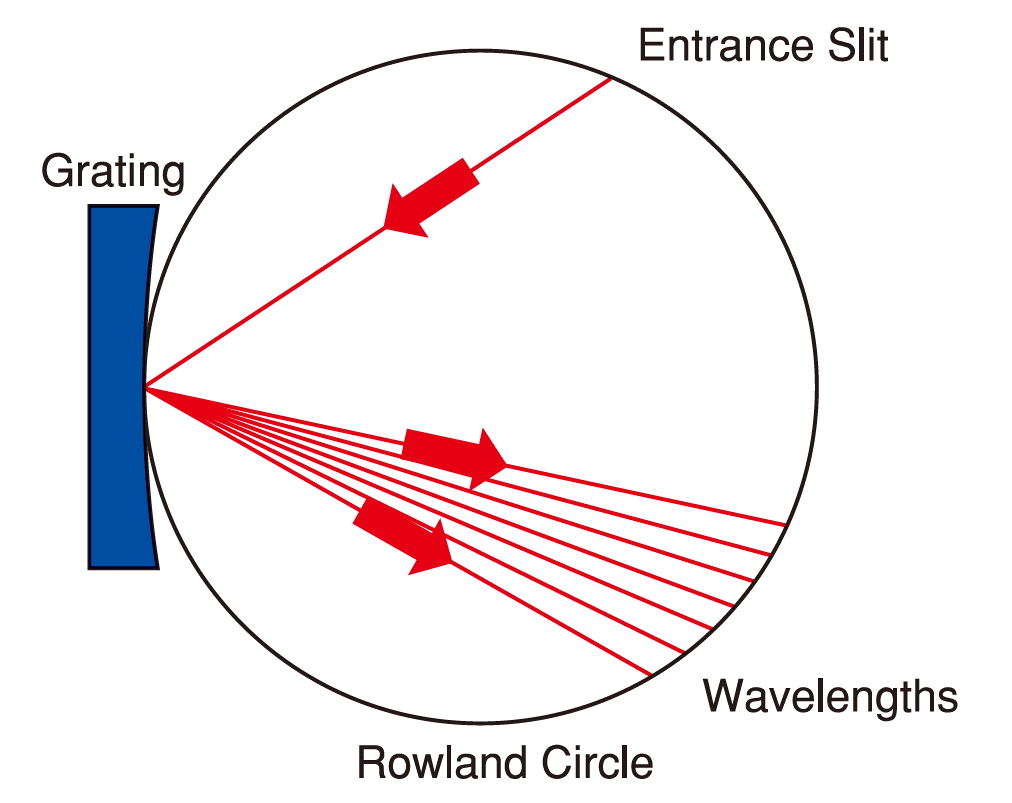 このグレーティングは平行かつ等間隔な溝を持っています。この凹面グレーティングはその分光スペクトルがローランドサークル上に結像し、その曲率は凹面グレーティングと同じになります。非点収差の影響は受けますがその他の収差の影響は極小化できます。